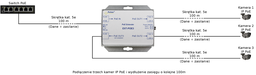 - Zastosowanie: Zwiększa zasięg danych Ethernet oraz zasilania PoE o kolejne 100m. Umożliwia podłączenie trzech kamer IP PoE przy wykorzystaniu jednego przewodu.