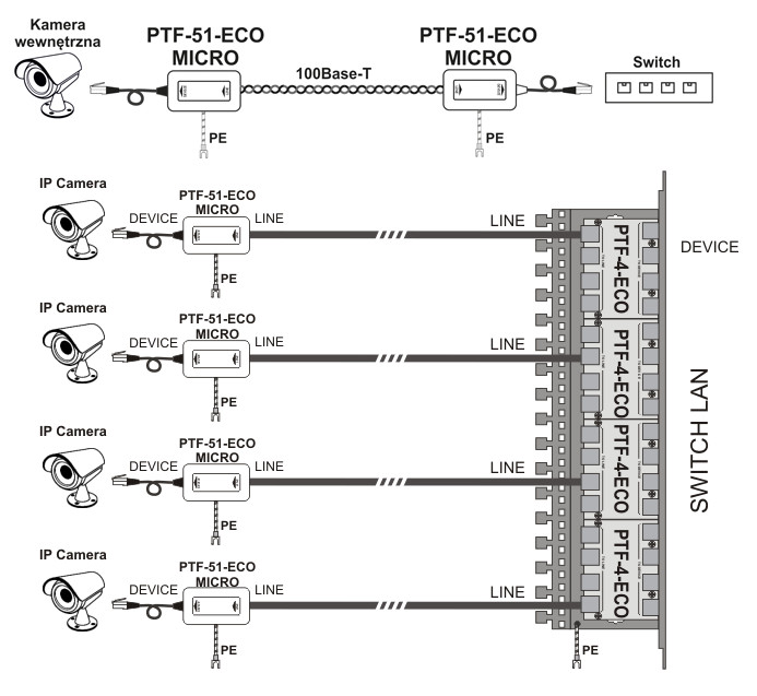 PTF-51-ECO/PoE/Micro jest miniaturowym ogranicznikiem przepięć, dedykowanym do sieci LAN 100-BaseT, opartych na przewodach UTP 5 lub 6 kategorii. Małe wymiary oraz wbudowany przewód z wtykiem umożliwia szybki i łatwy montaż oraz ukrywanie urządzenia w niedużych obudowach. Idealnie nadaje się do ochrony kamer przemysłowych IP, wyposażonych w oryginalne podstawy ukrywające akcesoria i wszelkie połączenia. Ogranicznik chroni przed skutkami przepięć oraz wyładowań atmosferycznych, a także aktami wandalizmu (działanie paralizatorów). Może być używane do zabezpieczania sieci LAN wewnątrz budynków, chroniąc urządzenia końcowe oraz switche lub mosty radiowe. Urządzenie indywidualnie chroni każdą parę transmisyjną, gdzie następuje eliminacja przepięć powyżej 6V wewnątrz nich.