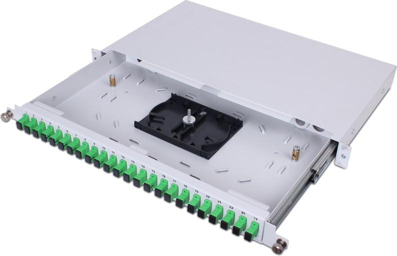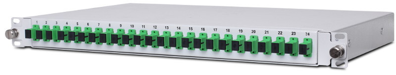 Przełącznica światłowodowa 19" 24x SC Simplex 1U z dwoma dławikami PG 13,5 w zestawie plus dwa miejsca na dodatkowe dławiki. Przełącznica posiada 24 porty pod adaptery światłowodowe umożliwia zakończenie do 24 włókien światłowodowych. Przystosowana do montażu w szafie Rack 19". Wyposażona w wysuwalną oraz demontowaną szufladę umożliwiającą wygodny dostęp do wnętrza.