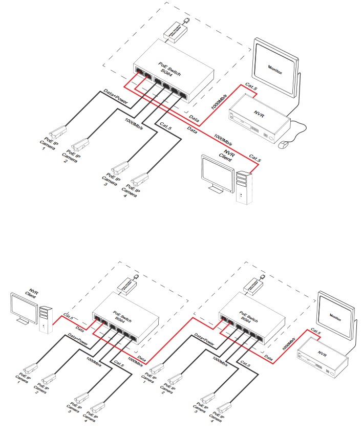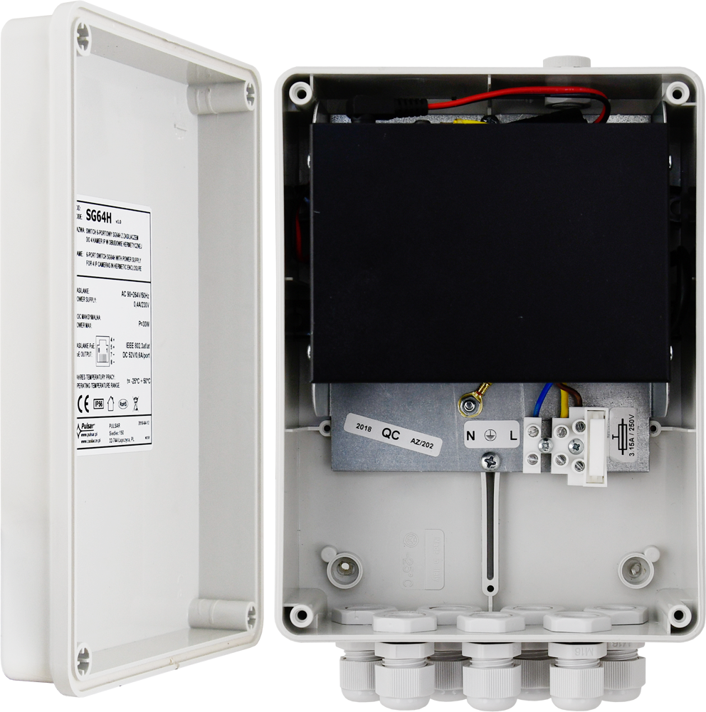SG64H to 6-portowy switch PoE przeznaczony do zasilania kamer IP pracujących w standardzie IEEE 802.3af/at.Switch na portach od 1 do 4 posiada funkcję automatycznej detekcji urządzeń zasilanych w standardzie PoE/PoE+. PortyUpLink służą do podłączenia kolejnych urządzeń sieciowych poprzez złącze RJ45. Na panelu przednim switcha znajdujesię sygnalizacja stanu pracy urządzenia zrealizowana na diodach LED.Technologia PoE zapewnia połączenie sieciowe oraz obniża koszty instalacji, eliminując potrzebę doprowadzaniaoddzielnego kabla zasilającego do każdego urządzania. Oprócz kamer w ten sposób mogą być zasilane urządzeniasieciowe, które korzystają z tej technologii np. telefon IP, access point, router.